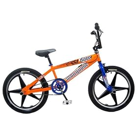 The Mongoose Ace Boy's Freestyle Bike is tricked out with high-performance features and ready for hardcore freestyle riding fun. With 20-inch wheels the Ace is both a great starter bike for kids seven years old and up, and performance ready for experienced BMX riders. The Ace features super-sturdy Aluminum five-spoke mag wheels with full wrap freestyle tires, four axle pegs, an ORYG rotor, a four-piece freestyle handlebar, and forged Mongoose one-piece cranks. Front caliper and rear alloy U-brakes offer optimum control and sure stopping power ideal for tricks and safety alike. Alloy pedals, brakes, alloy ahead stem, and Promax alloy brake levers are light and strong for years of use. The bike is equipped with a heavy-duty padded saddle to cushion the blows and dual-density grips for steady hands.