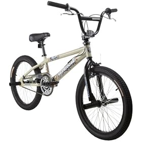 Classic BMX styling combined with a host of quality safety features make this a great bike for track and street riders. Equipped with a handcrafted Hi-Ten Boy's Team series frame and a handcrafted Hi-Ten jumping fork, the Mongoose Spin BMX bike is strong enough for off-road cycling, dirt jumping, and trick riding. The bike's front and rear U-brakes, meanwhile, offer all the braking power needed for safe, dependable stopping. Other details include front and rear axle pegs, a four-piece "knee-saver" handlebar, 20-by-2.125-inch black Jumper K-Rad tires, a large Mongoose Jumping saddle with stitches, alloy 48-hole hubs, a three-piece tubular crank set, and an A-head machined stem. The Mongoose Spin carries a lifetime warranty on the frame and fork.